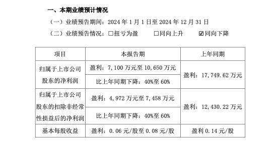 1月24日晚间,海宁皮城披露了2024年度业绩预告,2024年归属于上市公司股东的净利润盈利7,100万元至10,650万元,比上年同期下降40%至60%;归属于上市公司股东的扣除非经常性损益后的净利润盈利4,972万元至7,458万元,比上年同期下降40%至60%。值得注意的是,这已是该公司净利润连续三年下降。